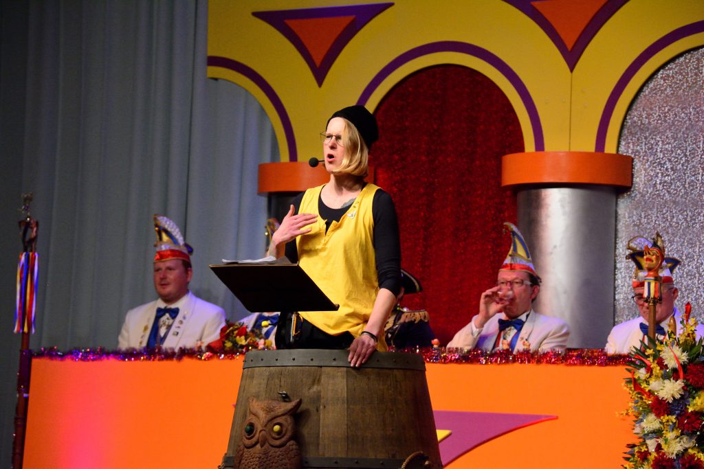 Zum Motto und zugleich mit einem klaren Appell auf den Lippen schlenderte „Sektion Tresen“ als „Sängerjugend“ durch die Kneipen in Heidesheim. Auf der Suche nach einem Stammtisch für sich stellten sie fest: „Noch e Kneipp weniger im Ort“. Bis sie die „frohe Botschaft“ erreichte: „Im Sportheim brennt noch das Licht“. Die Tristesse ist also doch nicht so trist. Ihr Fazit: „Geh nit fort – Bleib im Ort“. Das Publikum bejubelte sie genauso wie das Burgfräulein von der Burg Windeck alias Peter Winter: Seinem Kokolores-Vortrag applaudierte das Publikum im Minutentakt.